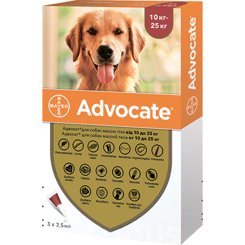 | > 10 – 25 кг | Адвокат® для великих собак | 2,5 | 10-25 | 2,5-6,25 |