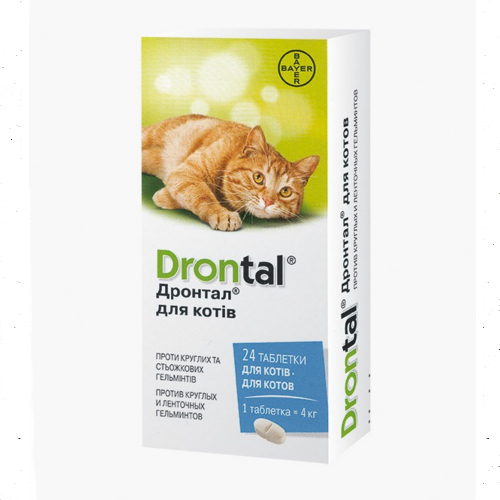 Активно діючі компоненти дронтала празиквантел і пірантелу ембонат виявляють синергізм дії і згубно діють проти круглих і стрічкових гельмінтів, в т.ч. Mesocestoides spp., що паразитують у кішок. Механізм дії празиквантелу полягає в деполяризації нейром’язових гангліоблокаторів, порушенні транспорту глюкози та мікротубулярної функції у цестод, що призводить до порушення м’язової іннервації, паралічу та загибелі паразиту. Празиквантел швидко всмоктується в кишечнику і розподіляється у внутрішніх органах та тканинах, виводиться з організму із сечею в основному у метаболізованій формі. Пірантела ембонат має виражену нематодоцидну дію, викликаючи підвищення проникності клітинних мембран, незворотний параліч та контрактуру м’язів у нематод, що призводить до загибелі та виділення паразитів із шлунково-кишкового тракту. Пірантела ембонат частково всмоктується в кишечнику, швидко метаболізується та виводиться з організму здебільшого з фекаліями. Дронтал за ступенем впливу на організм відноситься до малонебезпечних речовин (4 клас небезпеки за ГОСТ 12.1.007-76), у рекомендованих дозах не має ембріотоксичної, тератогенної та сенсибілізуючої дії. Добре переноситься кішками різних порід та віку. Дронтал за ступенем впливу на організм відноситься до малонебезпечних речовин (4 клас небезпеки за ГОСТ 12.1.007-76), у рекомендованих дозах не має ембріотоксичної, тератогенної та сенсибілізуючої дії. Добре переноситься кішками різних порід та віку. Дронтал за ступенем впливу на організм відноситься до малонебезпечних речовин (4 клас небезпеки за ГОСТ 12.1.007-76), у рекомендованих дозах не має ембріотоксичної, тератогенної та сенсибілізуючої дії. Добре переноситься кішками різних порід та віку.